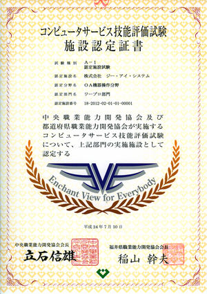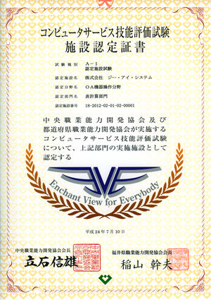株式会社ジー・アイ・システムは、コンピュータサービス技能評価試験のワープロ部門、表計算部門、PCドライビング部門の実施認定施設です。